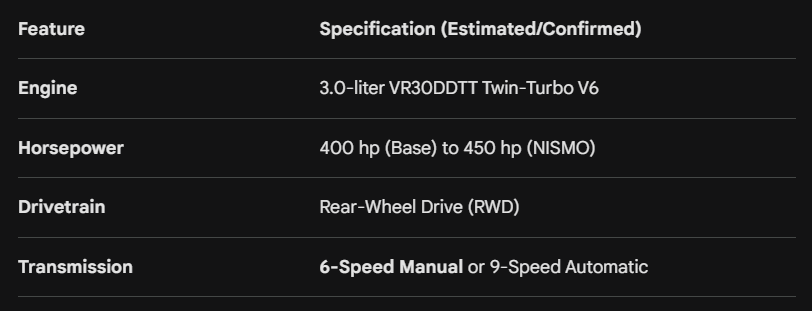 2027 Nissan Skyline is going to offer a 3.0 liter twin turbo model with 400 horsepower for base models and tuned to 450 horsepower for the NISMO model. Rear wheel drive is going to be offered as standard with option to chose from 6-speed manual or 9-speed automatic transmission.